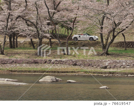 桜満開の三重県白山町リバーパーク真見の水辺公園を走るオープンカー
