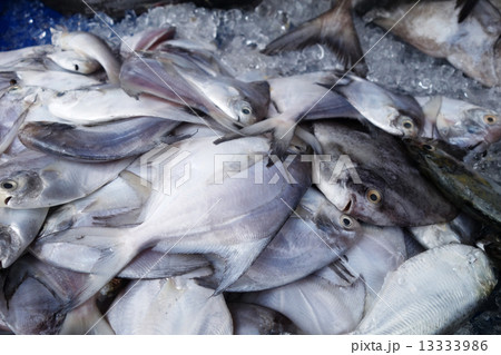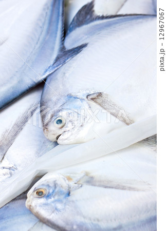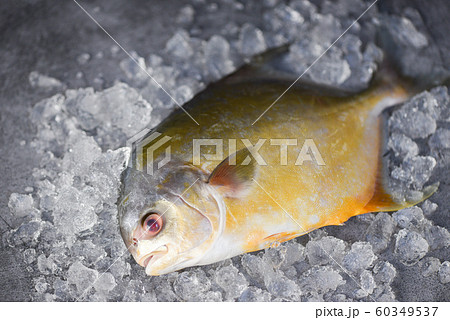 catch of fresh fish. Chilled pomfret fish at the Asian seafood market in Vietnam close-up