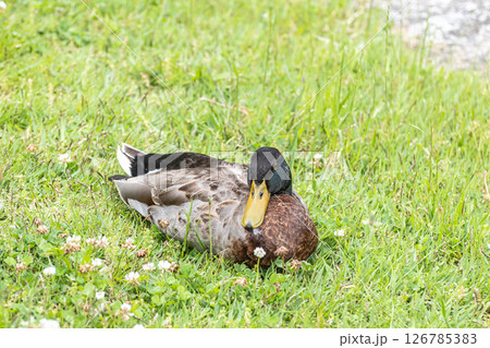 河川敷の緑地でくつろぐマガモ(オス) 京都市鴨川