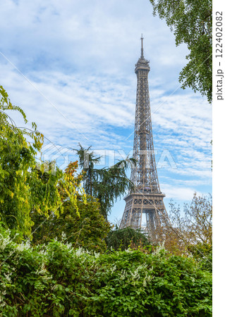 The Eiffel Tower is beautifully surrounded by lush greenery in the heart of Paris, France