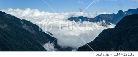 Landscape of Morning Mist with Mountain Layer. mountain ridge and clouds in rural jungle bush forest