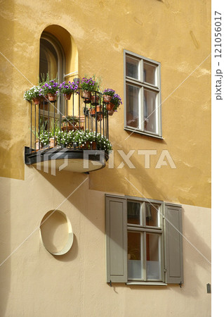 View of yellow city houses in Stockholm, Gamla Stan with potted flowers and plants growing on a balcony. Travel, tourism abroad, overseas for holiday, vacation. Scenic architecture view of empty home