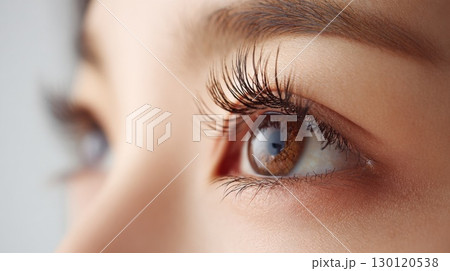 This captivating close-up captures the intricate details of a woman's eye, showcasing her long eyelashes and defined eyebrows against a soft background. The eye's unique color draws attention.