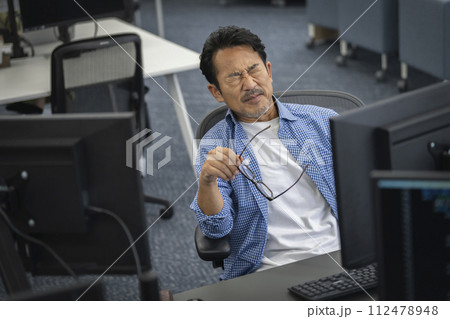 目を閉じて物思いにふける男性 ビジネスカジュアル