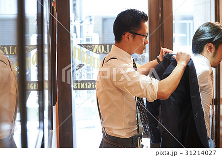 ジャケットをスタイリストに預ける男性客