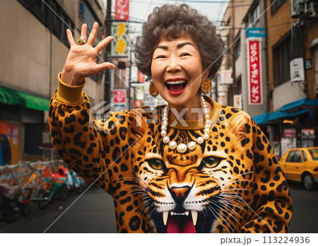 ヒョウ柄のトレーナーを着た大阪のおばちゃん。AI生成画像