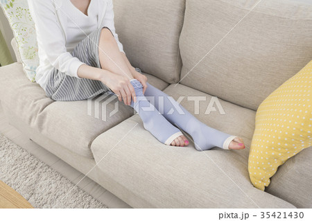 着圧ソックスをはく若い女性