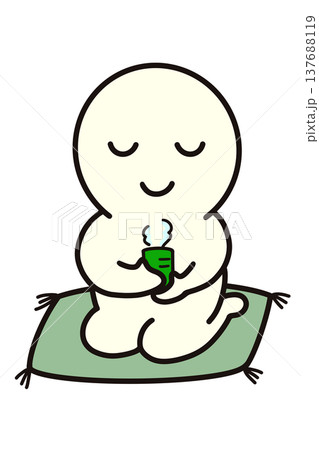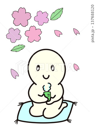 桜 春 座布団に座って お茶を飲む シンプルな人物
