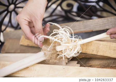 ファイヤースターターで火をつける子供手元 キャンプ着火イメージ