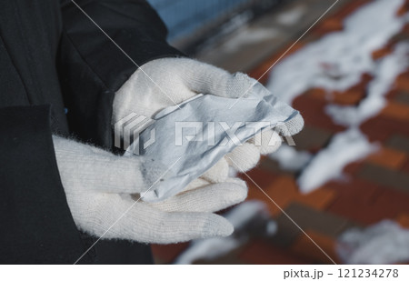 ネックウォーマーで防寒対策をする作業服の男性と積雪風景