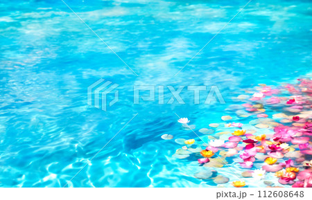 鮮やかでカラフルな花を浮かべた青い水面の背景 「AI生成画像」