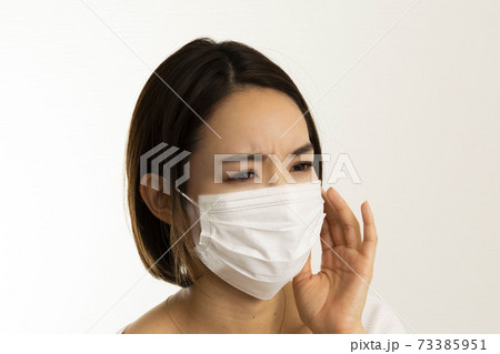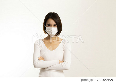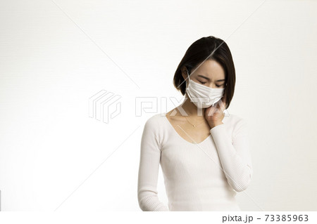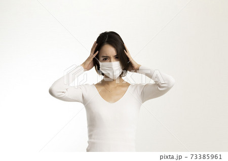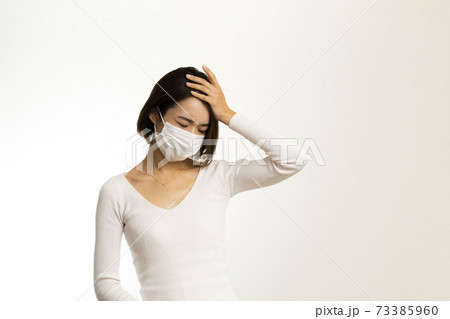 マスク姿の女性/頭痛/風邪の症状/熱の症状/白い服/