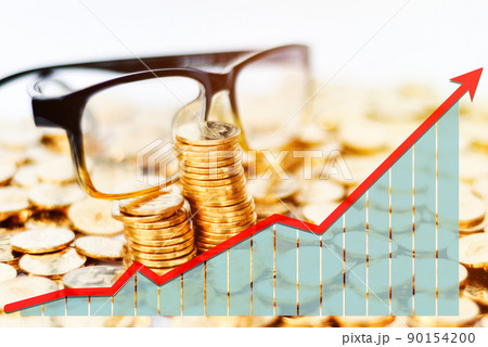 成堆的金幣與紅色上升箭頭股市相關素材圖