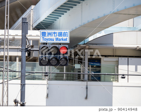 「豊洲市場前」交差点の標識と赤が点灯している矢印式信号機。(東京都江東区内)