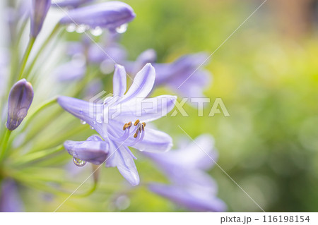 新緑の中で朝日を浴びて幻想的に浮かび上がりハイキーで生き生きとした青色の花とつぼみ(アガパンサス)