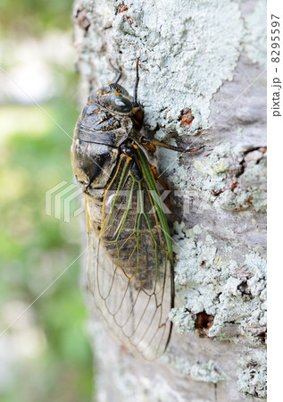 ハナミズキの枝にとまるアブラゼミ(雄)
