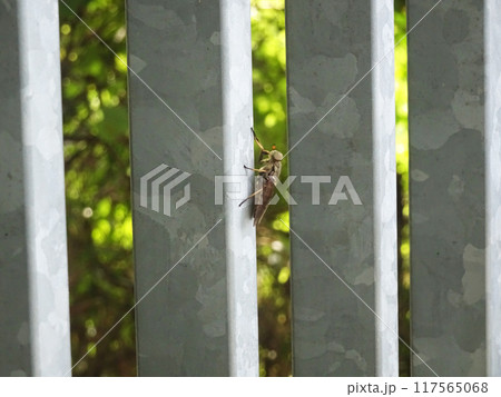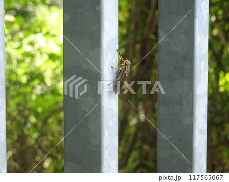 昆虫イメージ素材、フェンスにしがみついているアオメアブ、青緑色の複眼