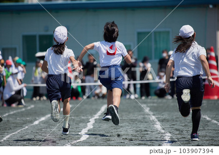 小学校の運動会で短距離走をしている学生達の姿