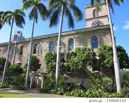 青空とヤシの木に映えるオワフ最古の石造りの教会 カワイアハオ教会 観光、広告、Web、記事、デザイン