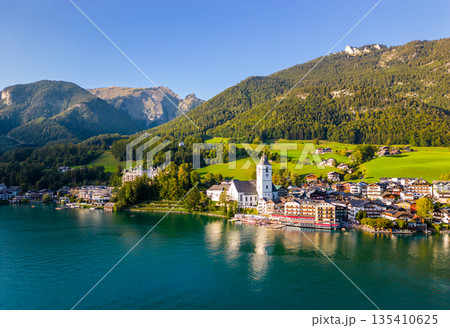 Beautiful aerial view of the popular village of Sankt Wolfgang im Salzkammergut. Alpine mountains, church and Wolfgangsee. Upper Austria, Salzburg.