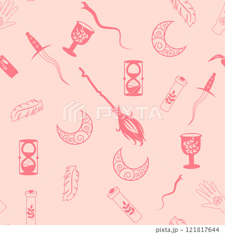 Silhouettes Magic symbols seamless pattern, with magical elements such as snake, eye, tarot cards, hand, skull. Witchcraft theme symbols and elements