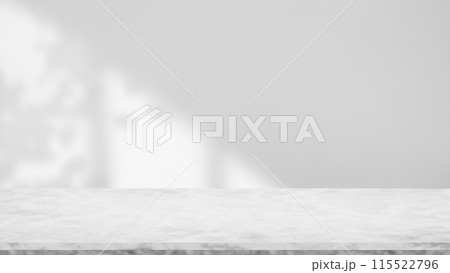 大理石のテーブルと葉の影がおしゃれな部屋の空間。白の壁背景