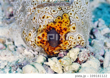 ジャノメナマコの肛門から顔を覗かせるボウズカクレウオ