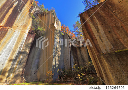 山形県 瓜割石庭公園(石切場跡)の秋の紅葉と岩壁の絶景