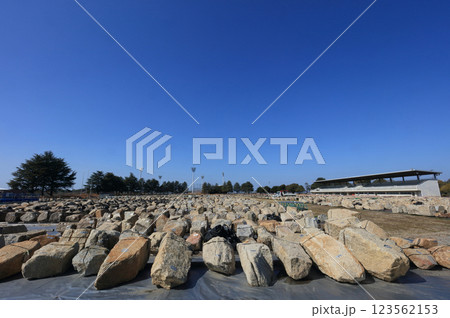 丸亀城石垣復旧事業、石垣の崩落で解体した石垣の石の仮置場(丸亀市総合運動公園)