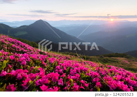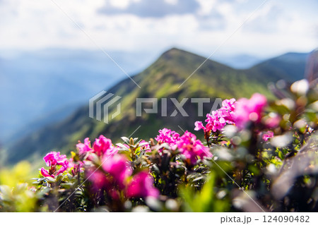 Pink rose rhododendron flowers on early morning summer mountain slope, Carpathian, Ukraine.