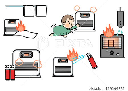 石油ファンヒーター前に置かれたスプレー缶の危険性イラスト