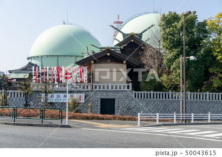 東京 浅草七福神めぐり 石浜神社の鳥居とガスタンク