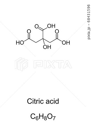 Citric acid, chemical structure and formula. Weak organic acid, naturally in citrus fruits. Intermediate in citric acid cycle. Used as acidifier, as flavoring and chelating agent. Illustration. Vector