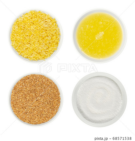 Lemon zest, juice and citric acid in white glass bowls. Fresh and dried grated lemon peel, freshly squeezed lemon juice and crystalline citric acid, monohydrate, used for culinary and cleaning. Photo.