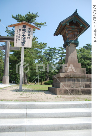 勢溜の二の鳥居(木製の正面鳥居)脇の立て看板・常夜灯(出雲大社/島根県出雲市大社町)