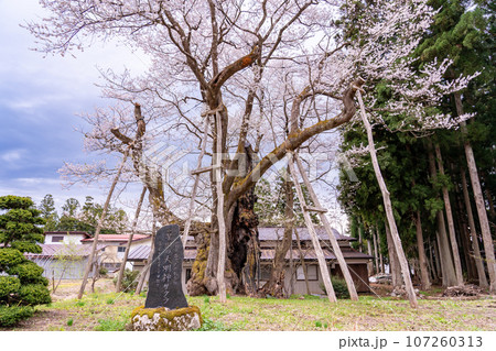 山形県長井市の置賜さくら回廊にある国内最大級の草岡の大明神ザクラと写真を撮る女性