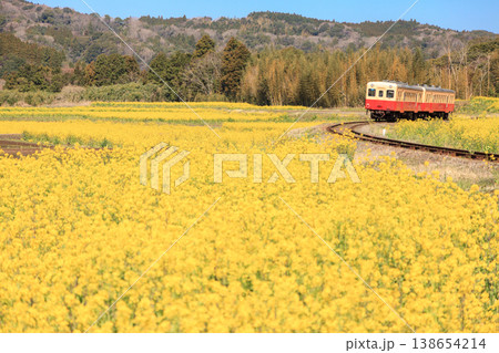 春の千葉小湊鉄道 石神の菜の花畑を走行するローカル列車(キハ200型)