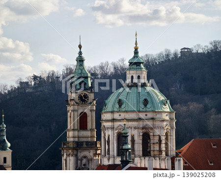 Historic Church Architecture. Vertical View Of Historic Church With Intricate Copper And Stone Design