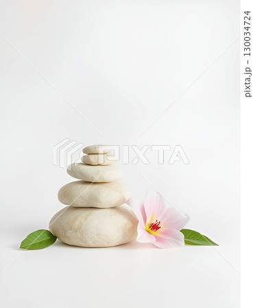 Stacked White Stones with a Pink Flower and Green Leaves, Natural composition for Decor and Wellness