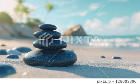 Stack balance Zen black stones on beach sand with sun bright blue sky landscape view
