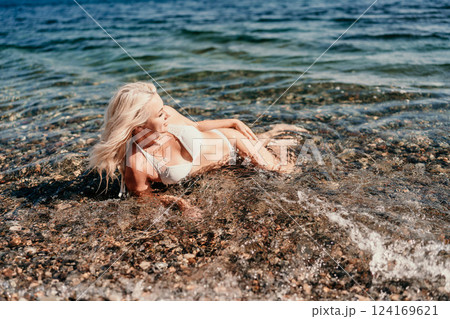 A blonde woman is laying in the ocean, wearing a white bikini