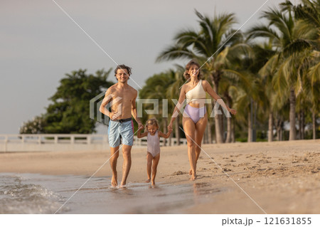 Family happy relaxing on beach children mother father travel summer vacation together sea holiday tropical Sunset time. Trip enjoying bonding. Family day having fun.