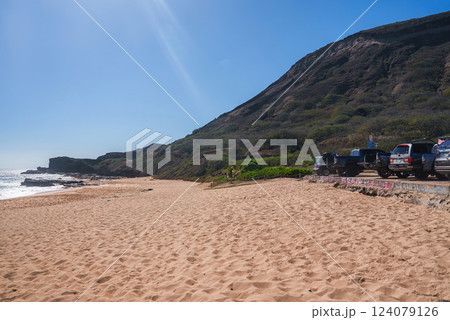 A serene sandy beach with ocean waves, a green covered hillside, parked vehicles along the edge, and a bright blue tropical sky in Hawaii.