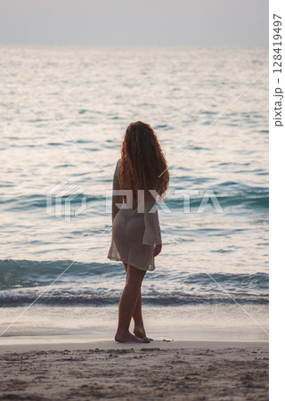 A barefoot woman with long curly hair stands on a sandy beach, facing the calm ocean. Soft lighting suggests sunrise or sunset, with gentle waves at the shore.