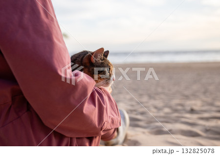 Woman with her domestic cat on lap sitting on beach coast on sunset, resting after walking outdoors.