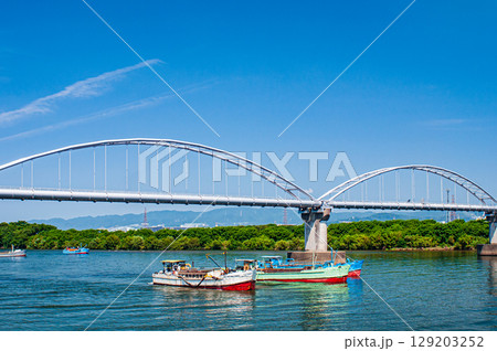淀川に架かる鳥飼仁和寺大橋と川を下る砂利採取船 守口市