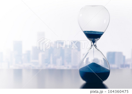 ビジネスにおける時間管理のイメージ。青い砂時計とビル群の背景。