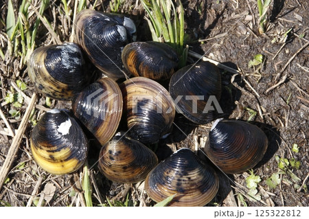 水路に散らばるマシジミ類と貝殻(島根県安来市)
