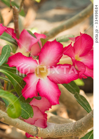 花 アデニウム 植物 砂漠のバラ デザート・ローズ 南国 バリ島 インドネシア 東南アジア 熱帯 自然 桃色 赤色 鮮やか 真夏 緑の葉 開花 満開 美しい 背景 トロピカル 新鮮 ガーデニング 木
