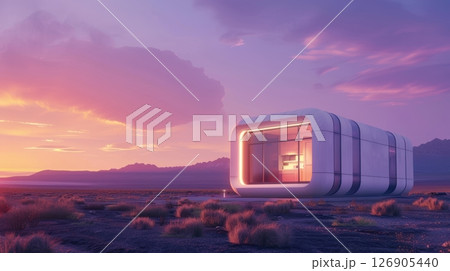 A modern, minimalist structure in a serene desert landscape at sunset, showcasing innovative architecture and vibrant colors.